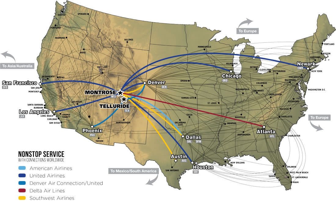With direct air service from major U.S. cities year-round, Montrose Regional Airport makes it easy to reach Montrose from virtually anywhere in the world. In summer, book non-stop flights from Denver, Phoenix, Dallas, Chicago, and Houston. Your options expand during ski season with direct flights from Atlanta, Austin, Chicago, Dallas, Denver, Houston, Los Angeles, New York, Phoenix, and San Francisco running throughout the winter. Check out special flight deals offered through the Colorado Flights Alliance.