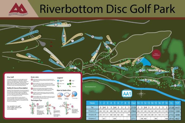 The course begins in Riverbottom Park and slowly ascends Sunset Mesa to the south. Good drives are critical to having reasonable approaches and makable putts. Beware of fences and roads as flying over them results in out-of-bounds. Check the weather before you go as high winds can make the mesa section of the course tough.