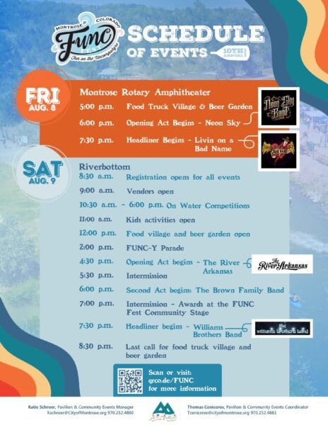 Calling all water sports enthusiasts and fun-loving folks to come out and enjoy the annual Fun on the Uncompahgre, aka “FUNC Fest” for two fun-filled days of activities, both on and off of the water. The event will occur at the Montrose Rotary Amphitheater on August 8 and at the Montrose Water Sports Park in Riverbottom Park on August 9, 2025.